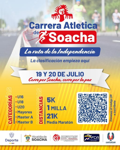 Después de 6 años, regresa la Carrera Atlética de Soacha “la ruta de la independencia”, el evento se llevará cabo en 2 jornadas, 19 y 20 de julio, y cuenta con el aval de la Liga de Atletismo de Cundinamarca y la Federación Colombiana de Atletismo, además, tendrá nuevo programa de competencias, hecho inédito en la historia de la prueba de calle, una de las más importantes de la región y del país, y será selectivo al campeonato suramericano de carreras de ruta, que tendrá como sede a Rio de Janeiro, Brasil, domingo 17 de agosto.