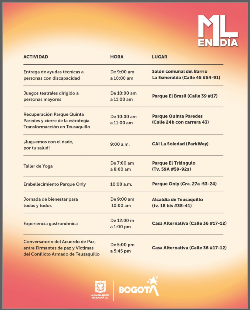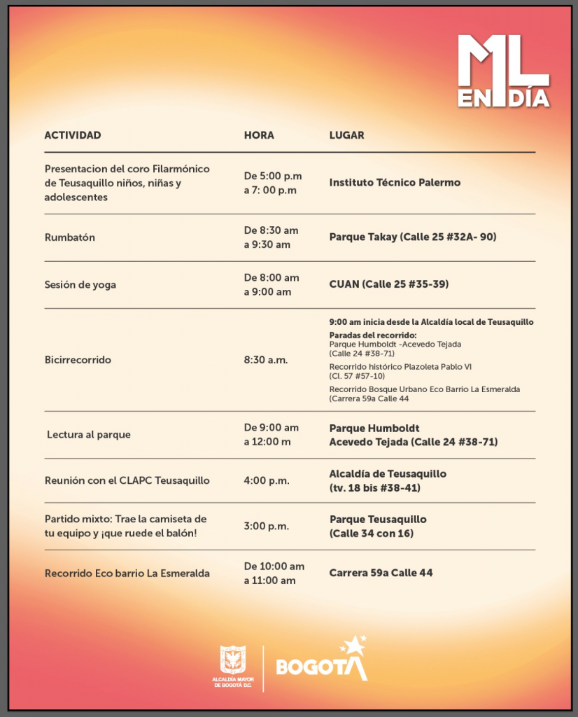 El viernes 29 de agosto de 2025, Teusaquillo será escenario de una programación especial que reúne a la comunidad en torno a más de 30 actividades. Desde las primeras horas de la mañana, diferentes espacios de la localidad se abrirán para el deporte, la cultura, la sostenibilidad y la participación ciudadana, en el marco de 1000 acciones en 1 Día.