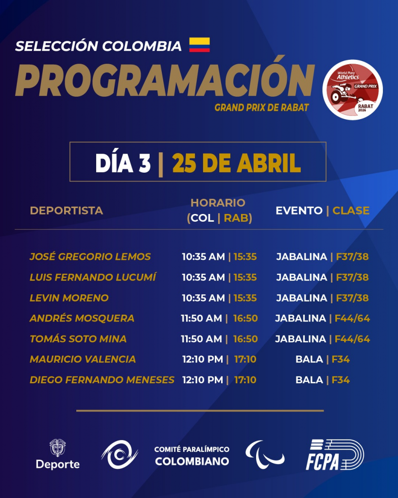 La Federación Colombiana de Para Atletismo, a través de sus redes sociales, estará informando sobre las noticias de nuestros deportistas en este importante evento mundial, previo al Grand Prix de Para Atletismo Cali 2026, a realizarse en el mes de septiembre.